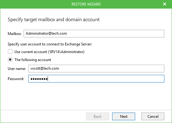 - Specify the account to connect to the target Exchange server. You can use your current account or provide another account in the corresponding format, depending on the target Exchange type:
