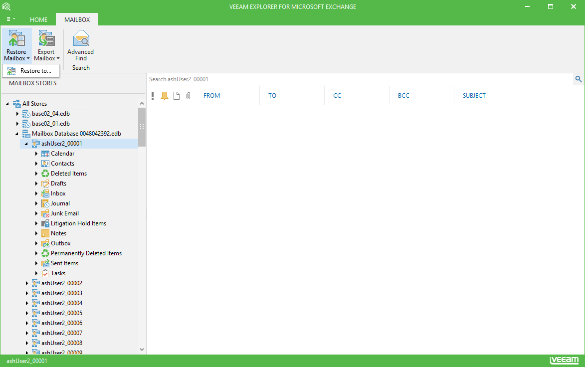 - In Veeam Explorer For Microsoft Exchange navigation pane, select a mailbox you want to restore.