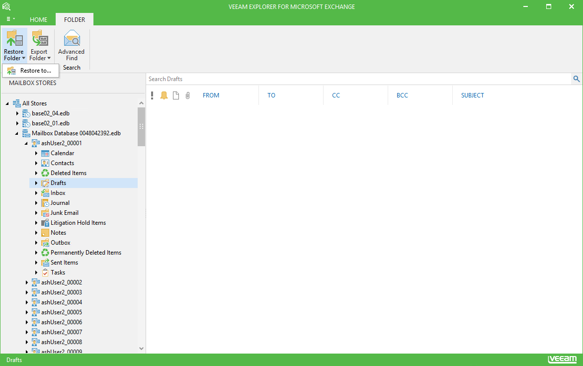 - In Veeam Explorer For Microsoft Exchange navigation pane, select a folder or mailbox item you want to restore.