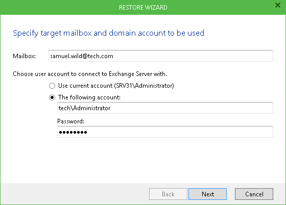 - Specify the target mailbox and domain account. You can either use your current account or specify a different one, having sufficient access level to perform the operation. See Required Permissions section. Click Next.