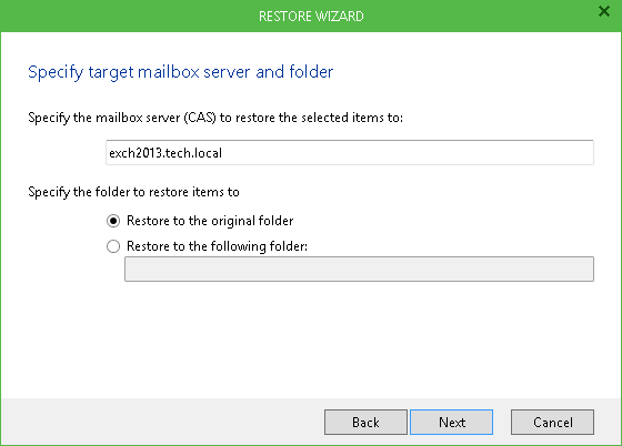 - Specify the target mailbox server and the folder to which you want to recover you data. You can restore to the original folder or specify a different one. If the specified folder does not exist on the target server, it will be created. Click Next. Consider the following: