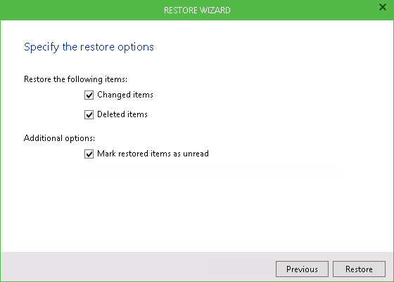- Depending on the object you want to restore, click Restore Folder or Restore Items and select Restore to. You can also use the corresponding context menu of an object.