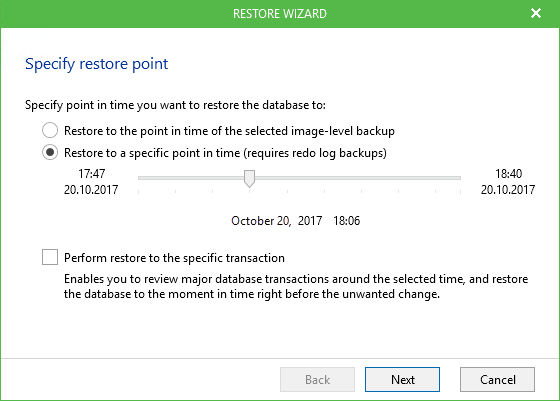 - Select Restore to a specific point in time option and use the slider to specify the necessary point, as described above. Leave the Perform restore to specific transaction check box unchecked.