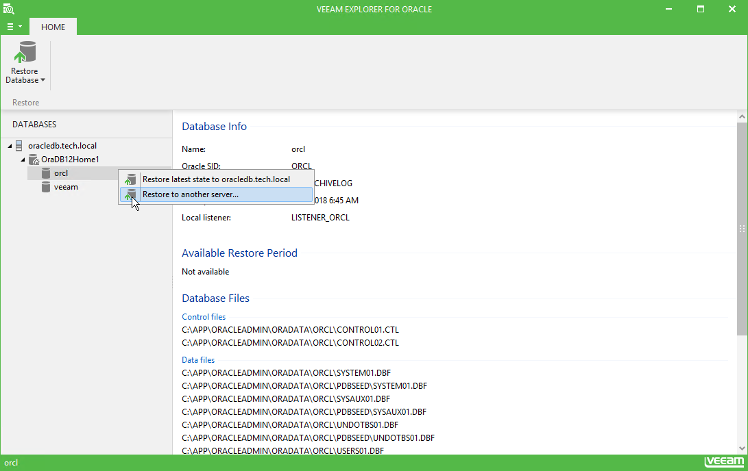 - In Veeam Explorer for Oracle main window, select the required database in the navigation tree on the left.
