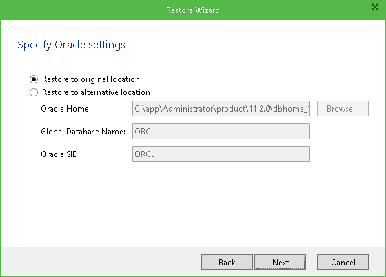- Restore to alternative location; in this case you should also specify Oracle Home, Global Database Name and Oracle SID where to restore the database from backup. You can click Browse to use Oracle Home Browser and select the necessary entity.