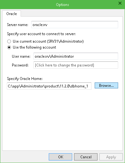 - Specify user account to connect to Oracle server. You can either use current account (under which Veeam Explorer is running) or specify another one. Make sure is has sufficient permissions, as described here.