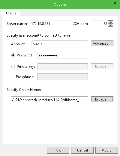 - Specify path to Oracle Home folder to be used. You can click Browse, and Veeam Oracle Home Browser will find the corresponding folder for you. If you plan to use Oracle 12c as a staging system, you may also need to enter a password to access Oracle Home on that machine.