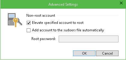 - To elevate specified account to root and to add it to sudoers, click Advanced. Select the options you need; if necessary, enter root password and click OK to save the settings and close the dialog.