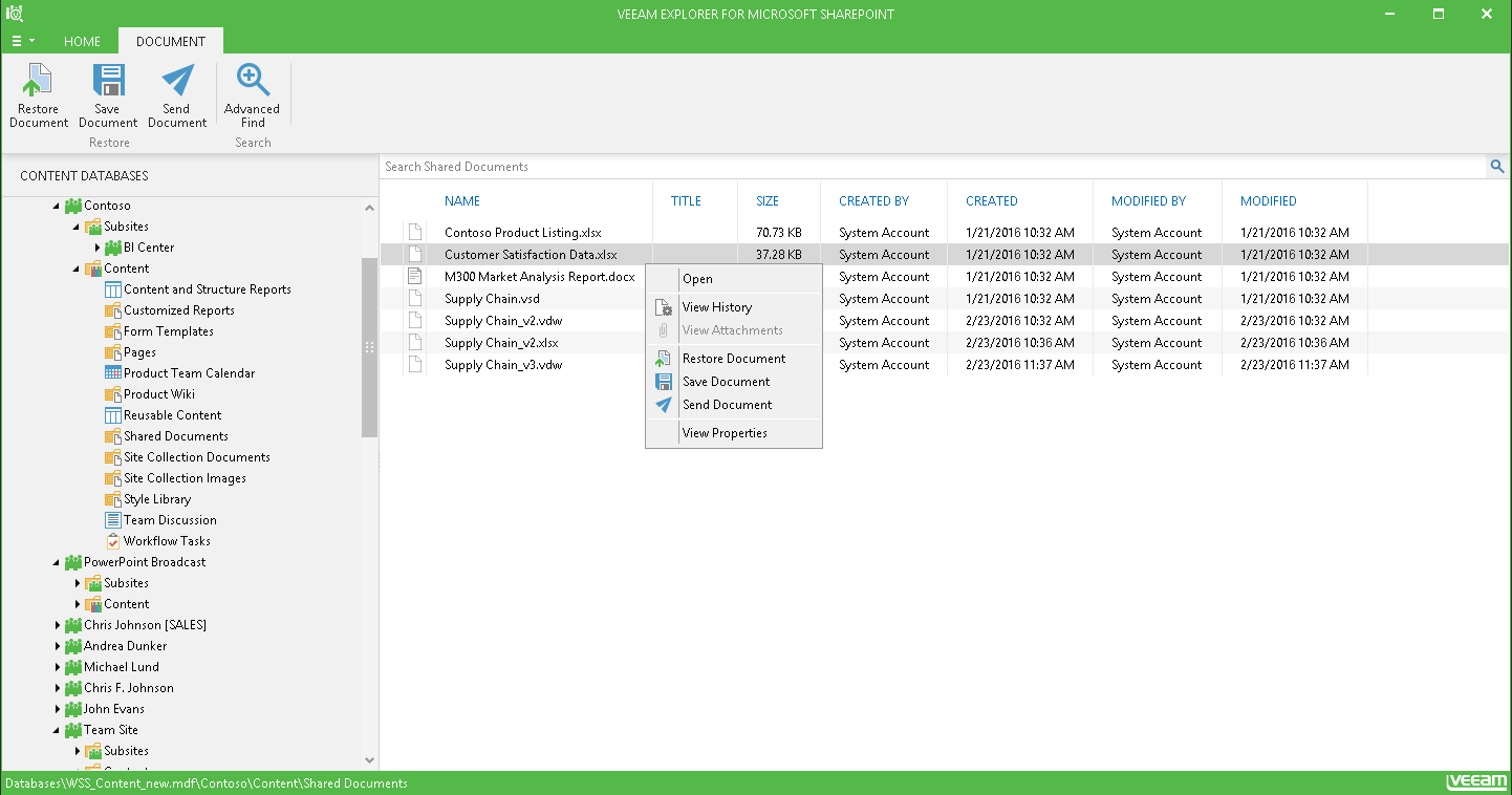 This section describes how to use Veeam Explorer for Microsoft SharePoint to browse the database content, open a document or view its properties, use simple or advanced search capabilities. This functionality is supported in all editions of Veeam Backup & Replication.