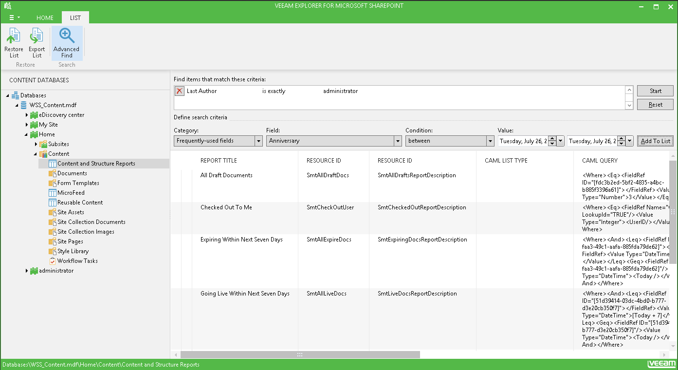 You can use the search abilities, which allows you to find items matching a specified search criteria. The search field is located at the top of the preview pane, For example, you can select a document library and search for veeam software to find all the documents that contain the words starting with 'veeam' or 'software' in the document name or document text. Search results for content databases and sites will include all child items (that is, subsites, lists and list objects).