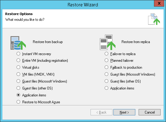 - In the Veeam Backup & Replication console, go to the Home tab, and click Restore. In the Restore Wizard window, select Application Items. You will be taken to the Step 1. Select Application of the Microsoft SharePoint Item Restore Wizard.