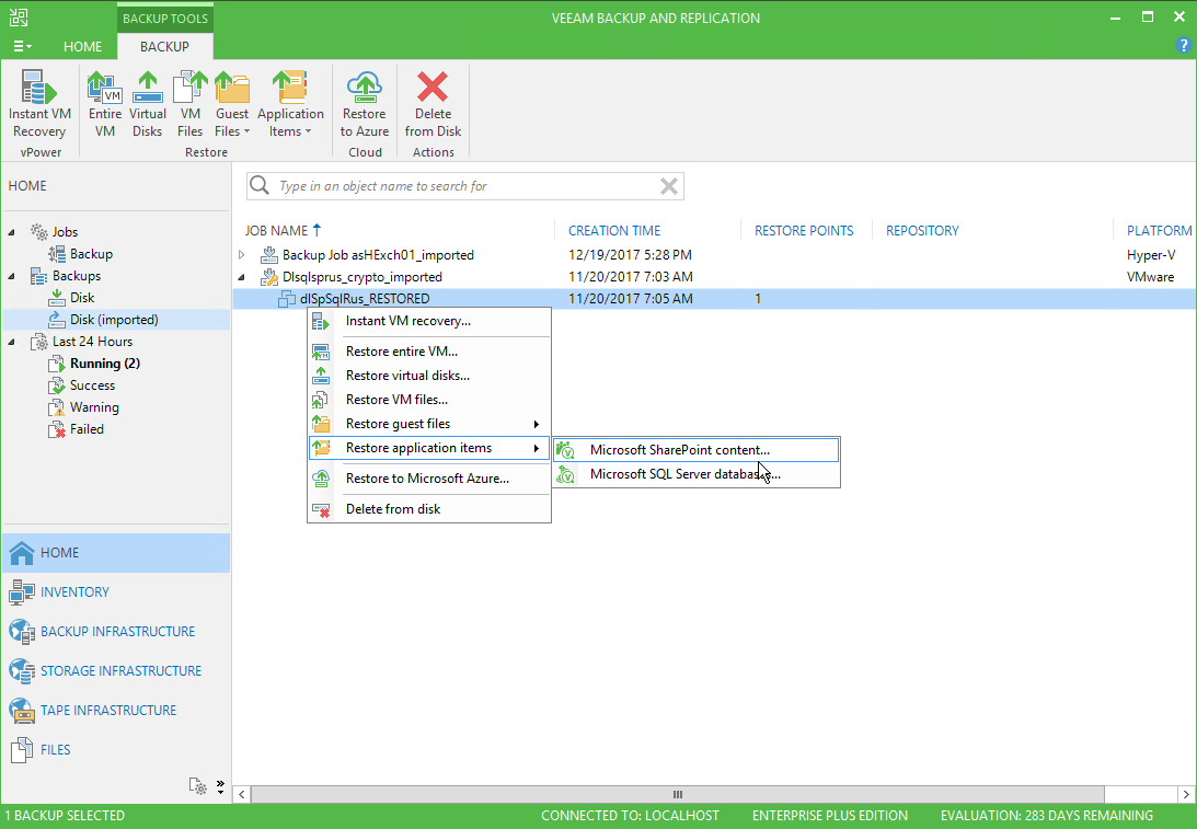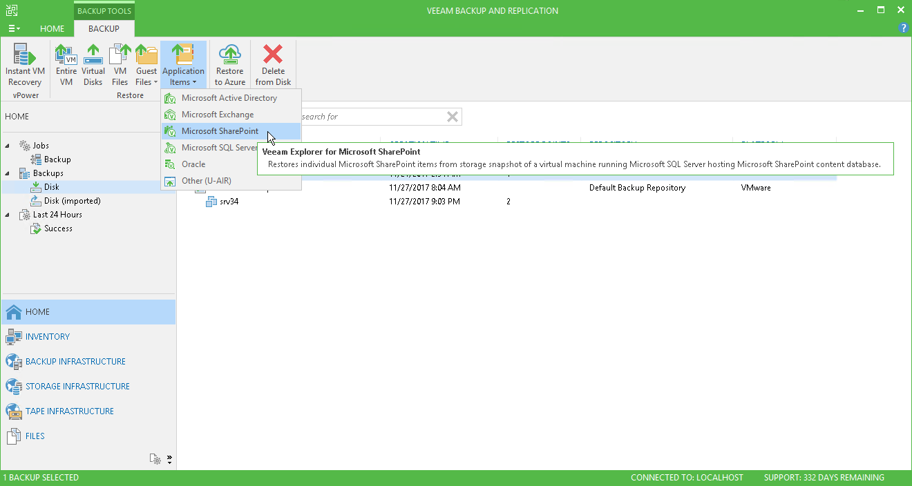 - In Veeam Backup & Replication, open the Home view. Select the Backups node, and in the working area on the right expand the backup or replication job with the SharePoint server you need. Select the SharePoint server VM and click Application items > Microsoft SharePoint on the toolbar in the Backup tab. Note that this course of actions can be used for regular and imported backups. You will be taken to the Step 3. Select Restore Point of the Microsoft SharePoint Item Restore Wizard.