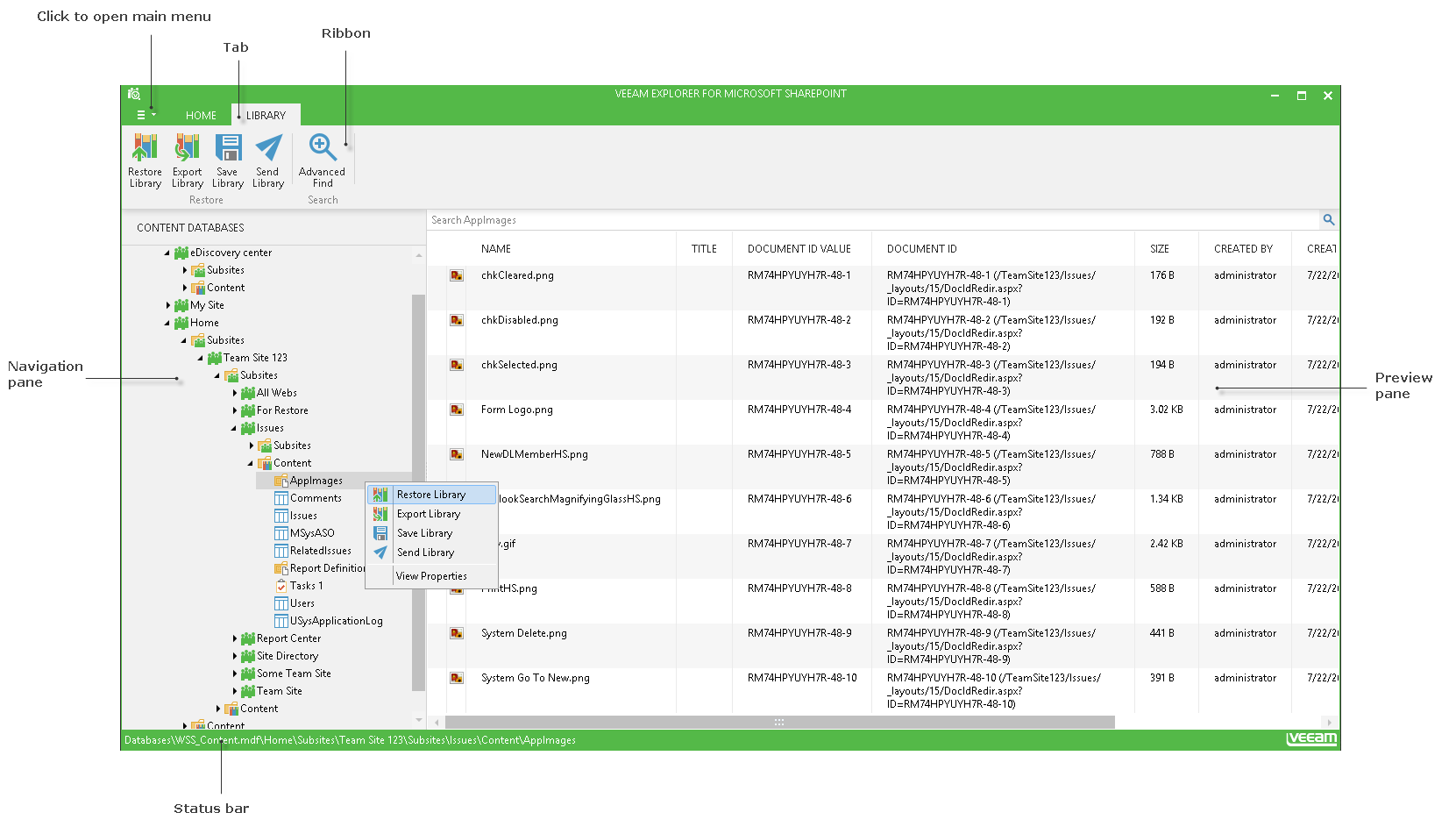 The user interface of Veeam Explorer for Microsoft SharePoint is designed to let you quickly find commands that you may need to perform necessary data protection and disaster recovery tasks.