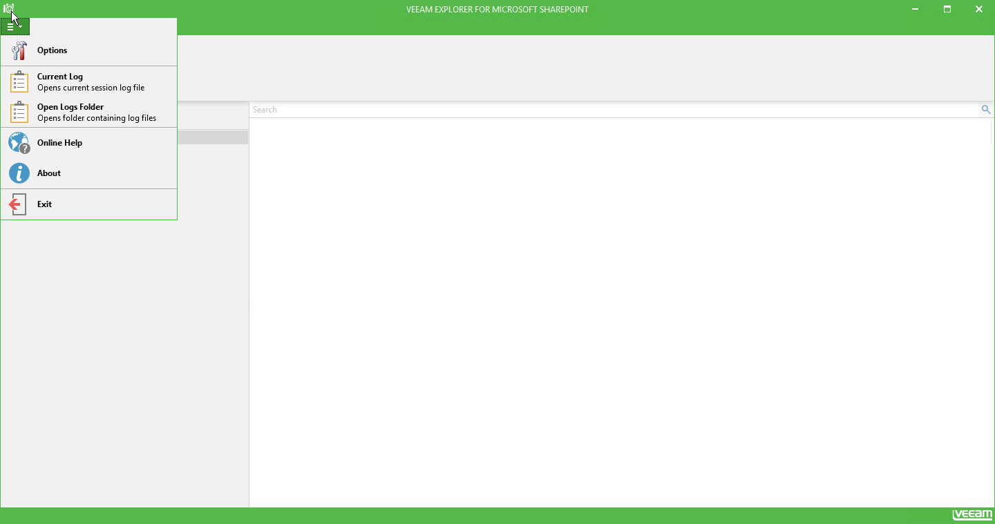 The main menu of Veeam Explorer for Microsoft SharePoint can be opened by clicking its icon in the top left corner of the main application window. Main menu comprises the following features: