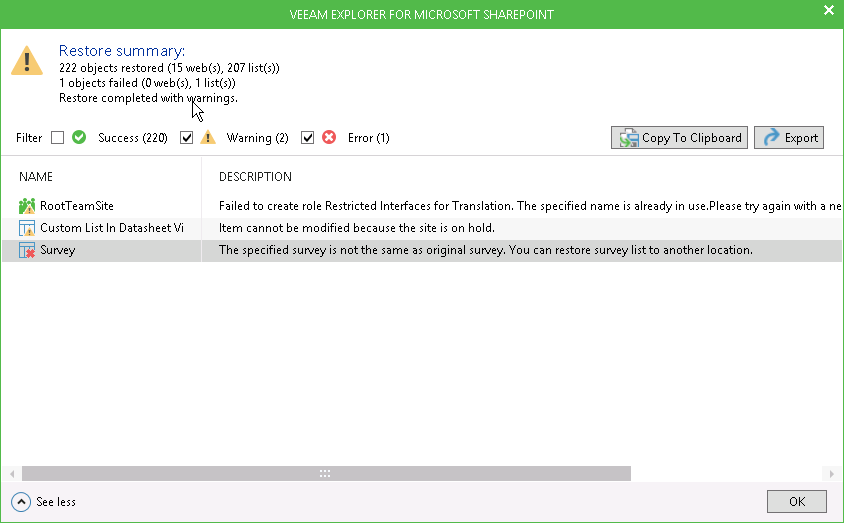Documents and list item objects do not appear in the list. If restore of such object completes with error or warning, this result will be bubbled to the upper-level object whose status will be changed accordingly (to error or warning). |