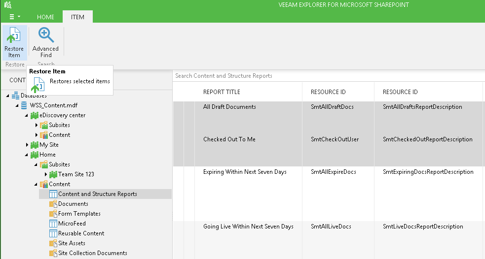 To restore a document or item, select it in the navigation pane and click Restore Document or Restore Item on the toolbar. You can also you the corresponding shortcut menu. Proceed with the Step 1. Specify Target SharePoint step of the restore wizard.
