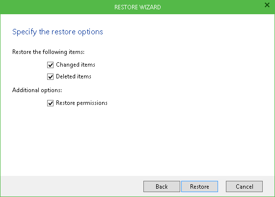 Specify the restore options you want to be applied — you can select to restore Changed items and/or Deleted items, as well as Restore permissions.