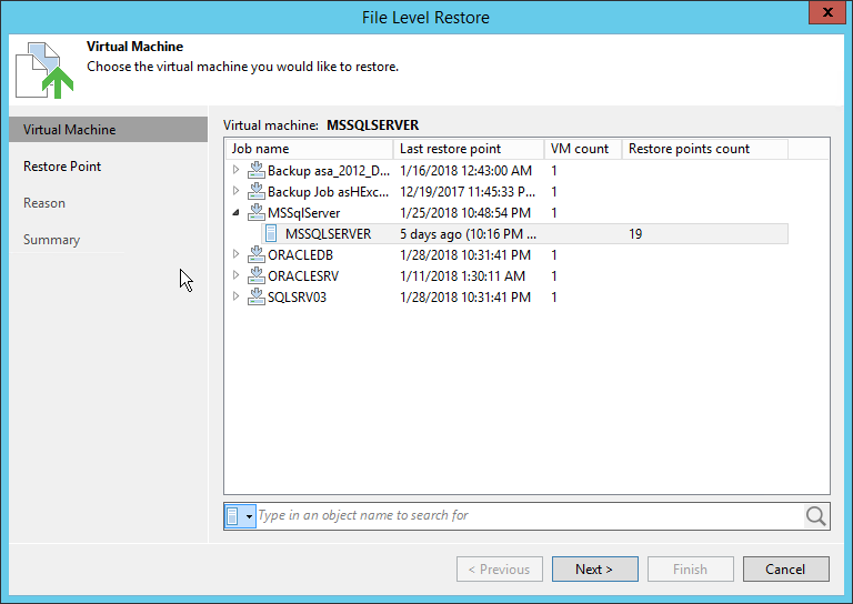 Select the backup or replica of the SQL server from which you want to restore your database. Such a backup must be created by a job with the application-aware image processing enabled. For more information, see Veeam Backup & Replication User Guide. Click Next.