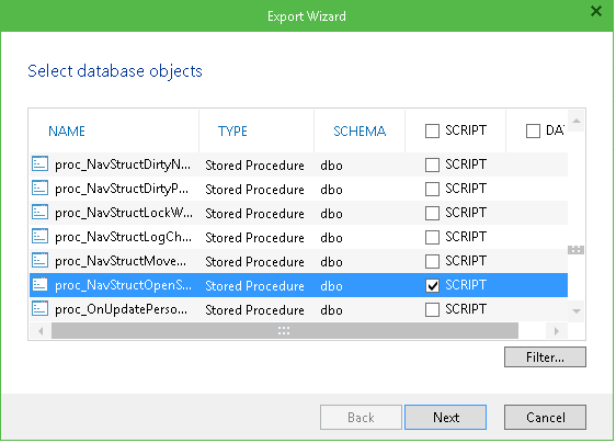 At the Select database objects step, review the list of database objects. Use the check boxes next to column names to select whether a database object and\or data should be restored. To display only specific objects, click Filter and select the object type you want to be shown in the list. Click Next to proceed to the Step 3. Specify Names for Objects.