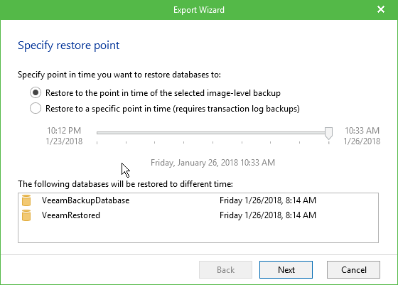 - The Restore to the point in time of the selected image-level backup scenario allows you to obtain database files as for the moment when the VM’s current restore point was created by backup or replication job. Click Next. You will be taken to the Step 2. Specify Database Files Location of the export wizard.