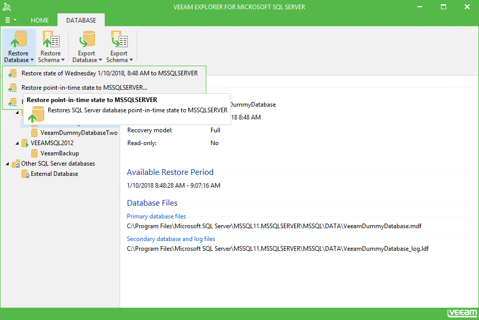 - To restore a single database, select Restore Database > Restore point-in-time state to <server_name>\<instance_name> on the toolbar or use the same command from the shortcut menu: