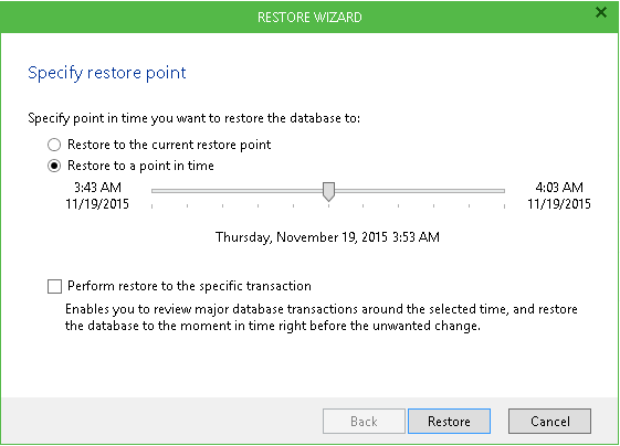 If restoring a single database, use the slider to select the necessary point. For details on using the time scale, see Restoring to Specific Point in Time.