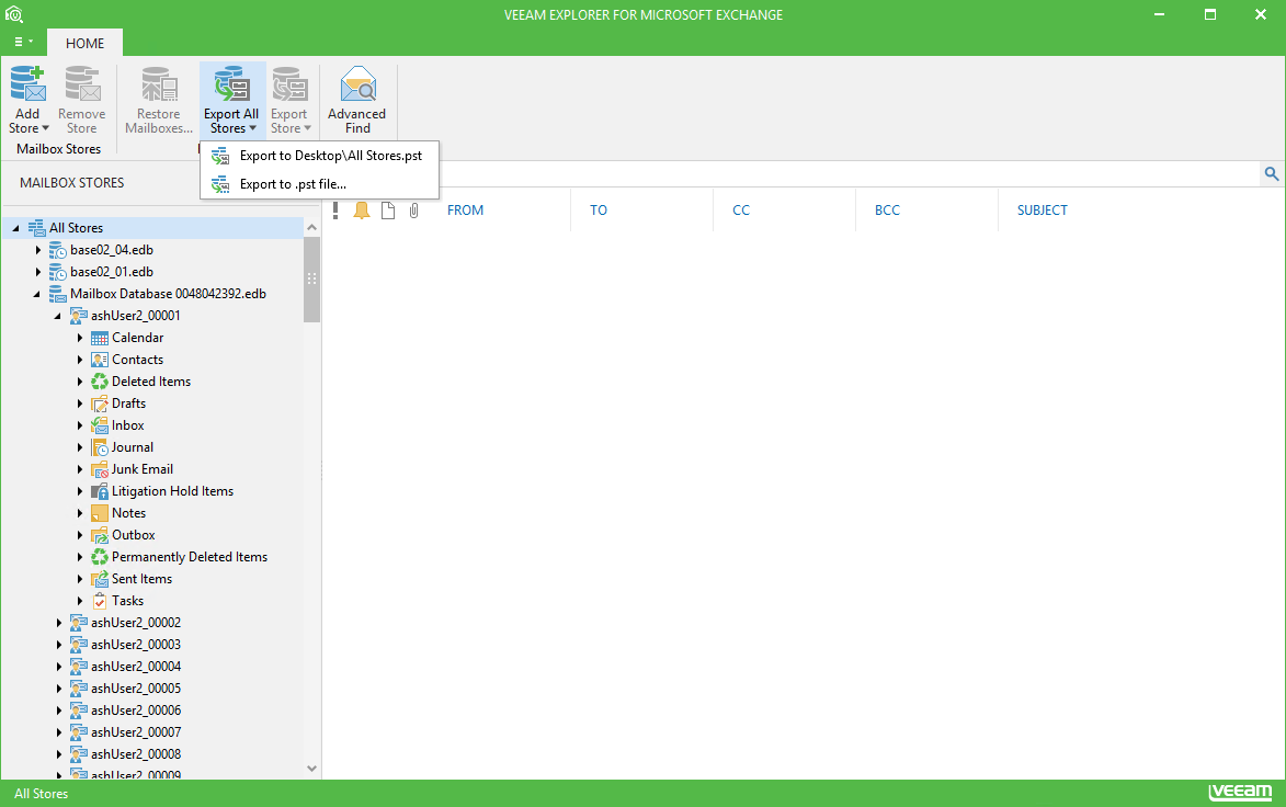 - Similarly, you can export selected mailbox store, or even all stores currently added to Veeam Explorer scope. For that, select, respectively, the required store node or the All Stores (root node), then use the corresponding Export command on the Home tab.