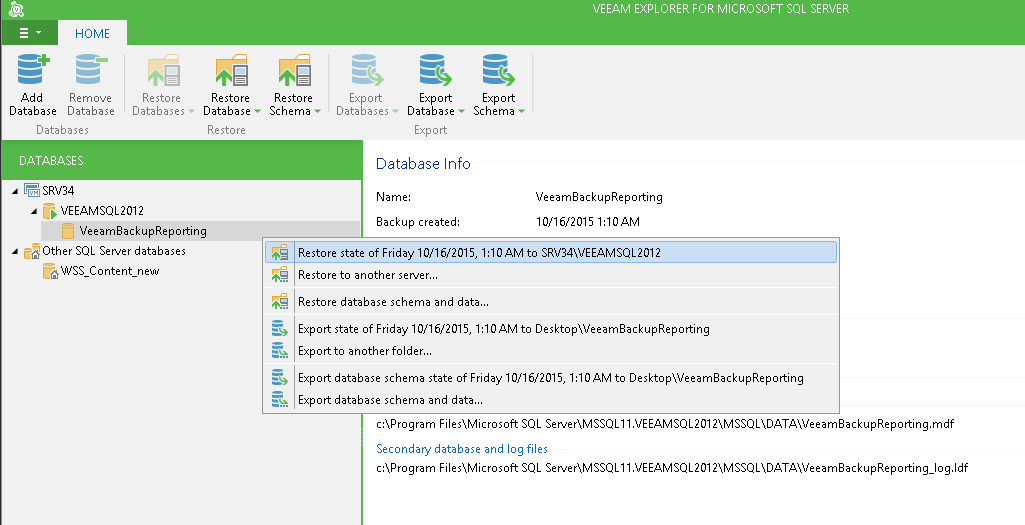 To restore database to the state as of in currently selected restore point, but to a server different from the original, follow the steps described in this section of Veeam Explorers document. If using Enterprise Manager, follow the steps described in this section of Veeam Enterprise Manager User Guide.