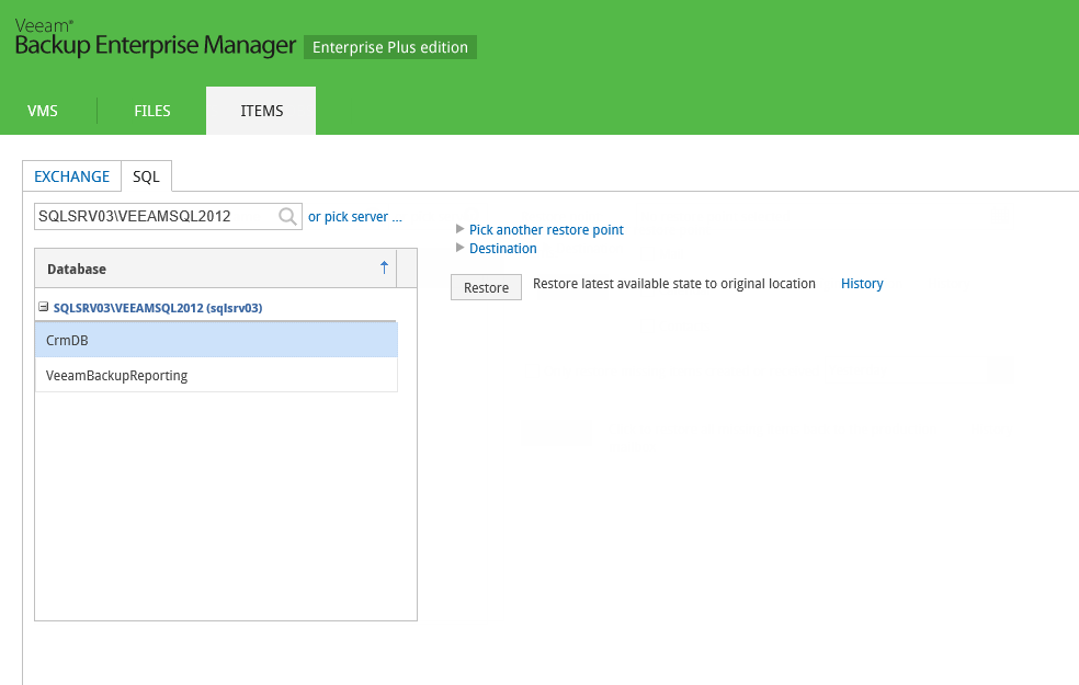 - Enter the name of SQL Server hosting the database you need to restore; use the server_name\instance_name format. Alternatively, click the link to pick server from the list of available SQL Server VM backups.