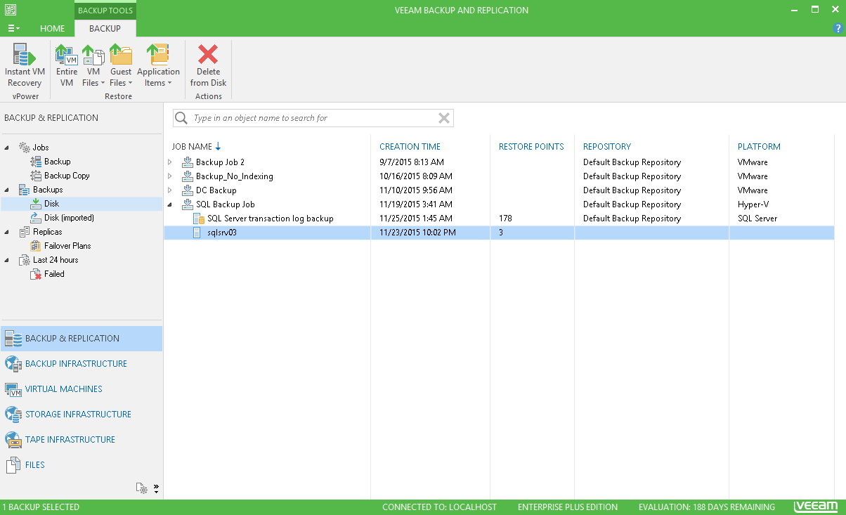 You can view summary information on the latest SQL Server VM and transaction log backup sessions under the Last 24 hours node in the Backup & Replication view.