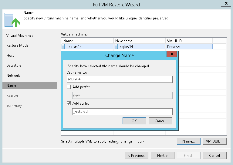 You can change a name of each restored VM and select whether you want to preserve its UUID or change it. It is recommended that you specify a new name and generate a new UUID for a VM to prevent conflicts if the original VM still resides in the production environment. The name and ID change is not required if the original VM no longer exists, for example, it was permanently deleted.