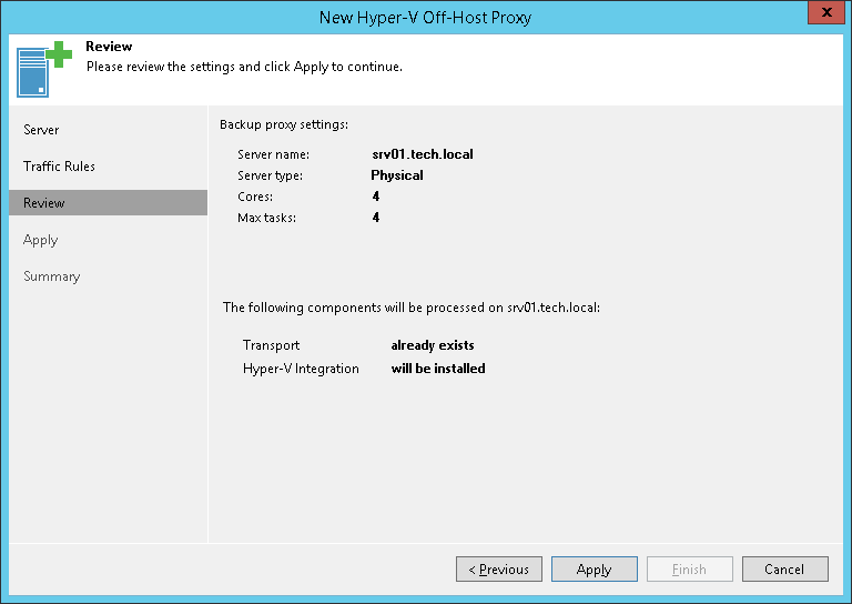 At the Review step of the wizard, review what Veeam Backup & Replication components are already installed on the off-host backup proxy and what components will be installed.