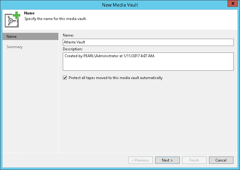 At the Name step of the wizard, you should define basic description for the new media vault.