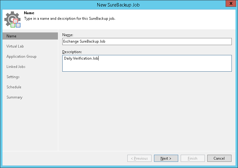 At the Name step of the wizard, specify a name and description for the SureBackup job.