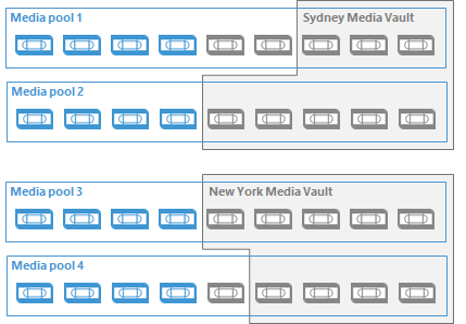 Media vaults visualize information about tapes. They store information about original location of tapes, such as library and media pool, data written to tapes and retention terms for it. Vaults are not limited to any original location of tapes: you can place tapes from different libraries and media pools to one media vault.
