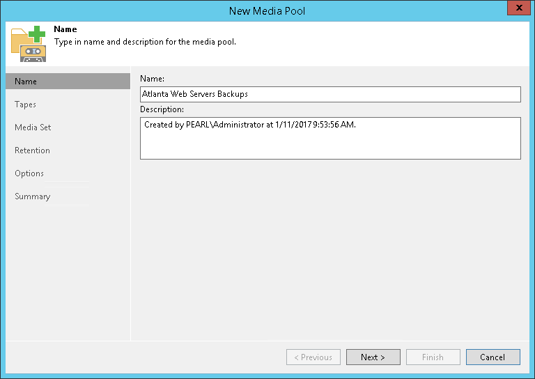 - In the Description field, enter a description of the new media pool. The default description contains information about the user who created the media pool, date and time when the media pool was created.
