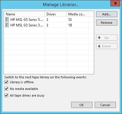 - To add multiple libraries to the media pool, click Manage. In the Manage Libraries window, click Add and select libraries that you want to add. Use Up and Down buttons to position the libraries in order they must fail over. The first library will be the primary. You can select any tape devices that are managed by this Veeam backup server even if they are connected to different tape servers.