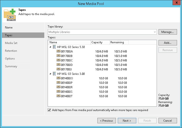 - To make the media pool replenishable, select the Add tapes from Free media pool automatically when more tapes are required check box.