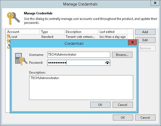 5. In the Description field, enter a description for the created credentials record. As there can be a number of similar account names, for example, Administrator, it is recommended that you provide a meaningful unique description for the credentials record so that you can distinguish it in the list. The description is shown in brackets, following the user name.