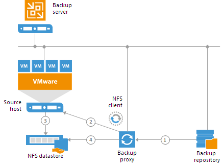 - Data blocks obtained from the backup proxy are written to the NFS datastore over LAN.