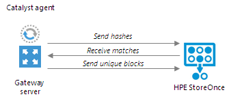 - HPE StoreOnce identifies which data blocks are already saved on disk and communicates this information to the HPE StoreOnce Catalyst agent. The HPE StoreOnce Catalyst agent sends only unique data blocks to target.