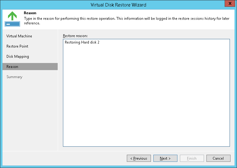 At the Reason step of the wizard, enter a reason for restoring VM disk(s). The information you provide will be saved in the session history and you can reference it later.