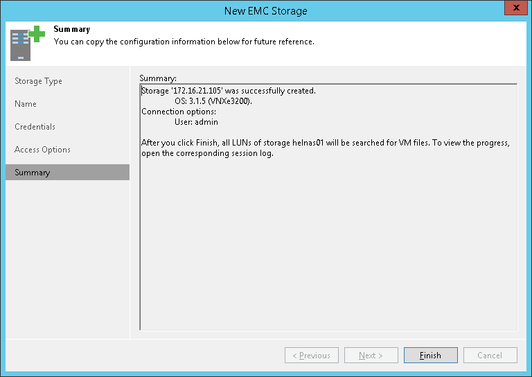 This is an archive version of the document. To get the most up-to-date information, see the current version. Step 6. Finish Working with Wizard In this article At the Summary step of the wizard, review settings of the added storage system and click Finish to start the rescan process.
