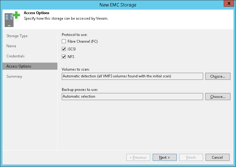 - Operations of storage rescan and Backup from Storage Snapshots are performed with the help of a backup proxy. On the right of the Backup proxies to use field, click Choose and define backup proxies that you want to use for these operations.