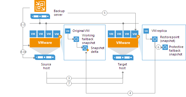 - Veeam Backup & Replication creates a failback protective snapshot for the VM replica. The snapshot acts as a new restore point and saves the pre-failback state of the VM replica. You can use this snapshot to return to the pre-failback state of the VM replica afterwards.