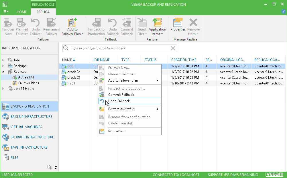 - Open the Backup & Replication view and select the Replicas node. In the working area, right-click the necessary replica and select Undo Failback.