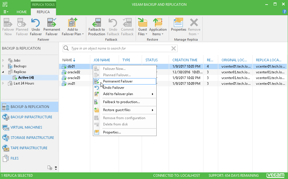 - Open the Backup & Replication view, in the inventory pane select Replicas. In the working area, right-click the necessary replica and select Permanent Failover.