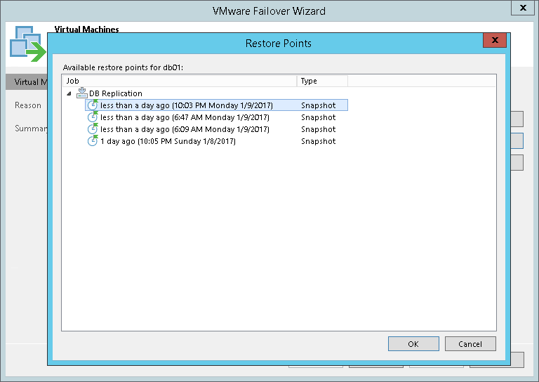 By default, Veeam Backup & Replication uses the latest valid restore point of the VM replica. However, you can fail over to an earlier state of the VM. If you have chosen to perform failover for several VMs, you can select the necessary restore point for every VM in the list.