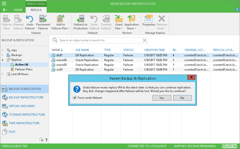 - In the working area, select the necessary replica and click Undo Failover on the ribbon. You can also right-click the necessary replica and select Undo Failover.