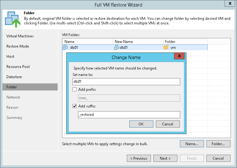 The Folder step of the wizard is available if you have chosen to change the location and settings for the restored VM.
